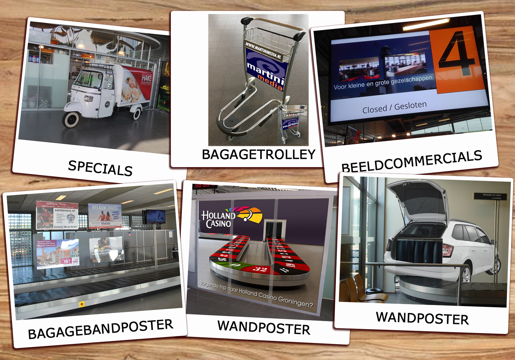 ReclamemogelijkhedenEen greep uit andere reclamemogelijkheden op vliegveld Eelde zijn: bewegende beeld commercials op het interne tv-systeem (narrowcasting), samples promotion, bestickering van vliegtuigtrappen, bagagekarren en adverteren rondom de bagageband. Ook kunt u adverterenop zuilen, roll-up banners, vlaggen, slagbomen, parkeertickets en billboards. Op de website van Groningen Airport Eelde (GAE) kunt u adverteren op de hotelpagina en de taxipagina middels een korte bedrijfspresentatie aangevuld met een mooie foto. | ![]() |
